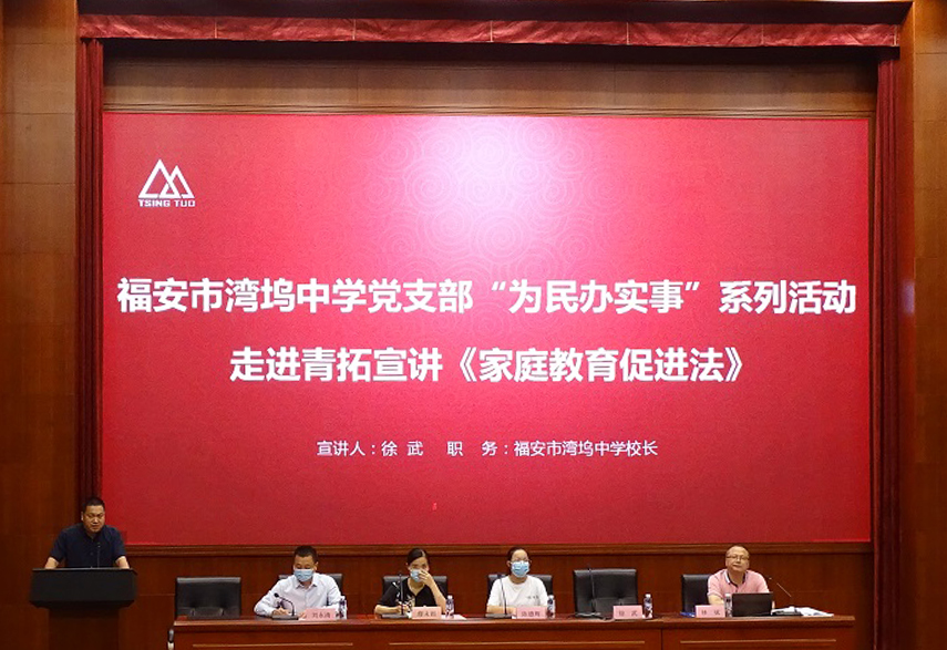6月1日,福安市湾坞中学党支部“为民办实事”系列活动之走进青拓宣讲《家庭教育促进法》在青拓集团有限公司报告厅举行,宁德市人大代表兼福安市家庭教育指导协会副会长缪未雨,福安市湾坞镇党委宣传委员陈德辉,福安市湾坞中学校长徐武,福建怀行律师事务所法律顾问林斌,青拓集团人力资源部部长刘永清及89名青拓职工家长参加了此次活动。
