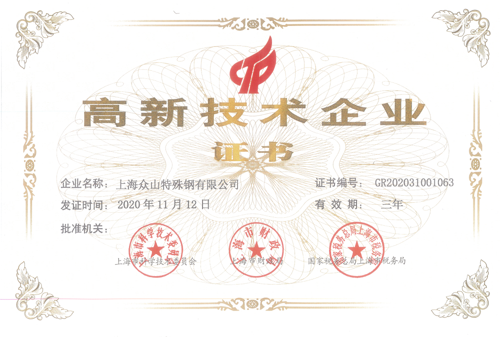 日前,上海众山特殊钢有限公司取得国家高新技术企业证书,标志着众山特钢具备自主创新的科技研发实力。