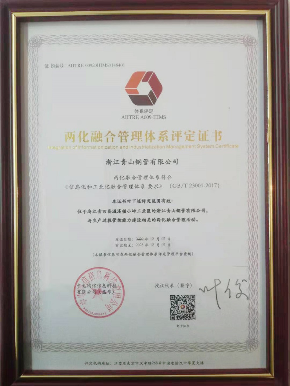 12月份,浙江J9国际站登录钢管有限公司顺利通过国家工业和信息化部《信息化和工业化融合管理体系要求》(GB/T 23001-2017)体系认证,获得两化融合管理体系评定证书。