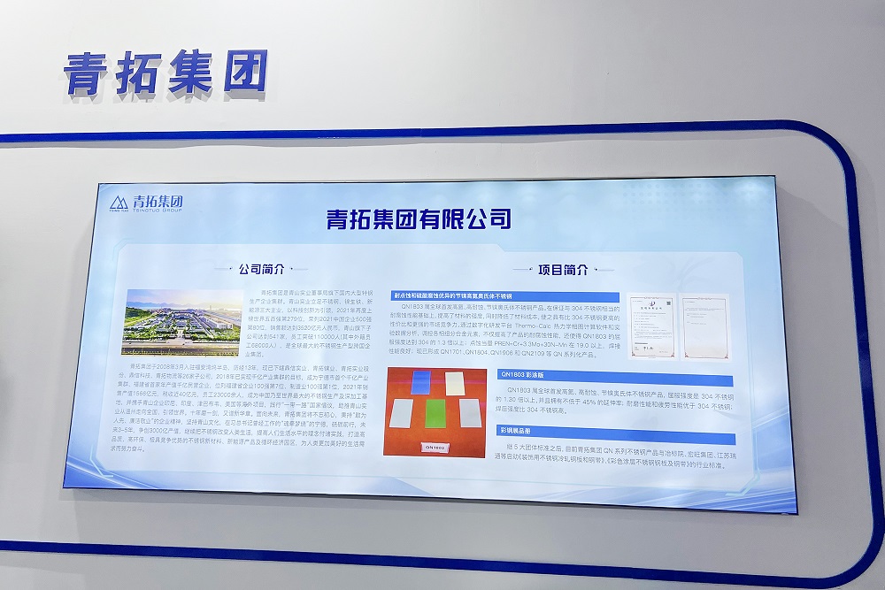 在创新成果展20周年展区,青拓集团“耐点蚀和硫酸腐蚀优异的节镍高氮奥氏体不锈钢”项目作为第二十届海创会组委会评选的创新项目展出,见证海创会科技成果转化、企业自主创新的历程。